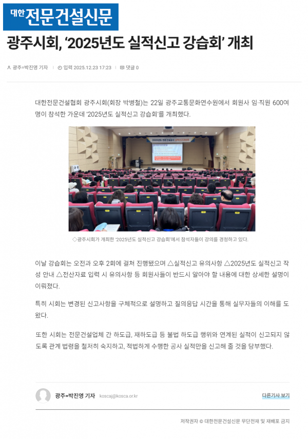 광주시회, ‘2025년도 실적신고 강습회’ 개최 (대한전문건설신문) 페이지 정보 작성자 전문건설협회광주광역시회 댓글 0건 조회 450회 작성일 2025-12-24 13:57 목록 본문