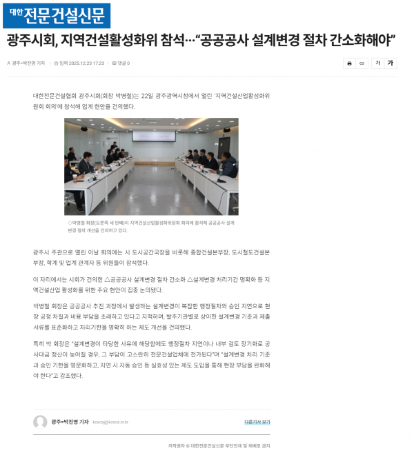 광주시회, 지역건설활성화위 참석···“공공공사 설계변경 절차 간소화해야” (대한전문건설신문) 페이지 정보 작성자 전문건설협회광주광역시회 댓글 0건 조회 476회 작성일 2025-12-24 13:57 목록 본문