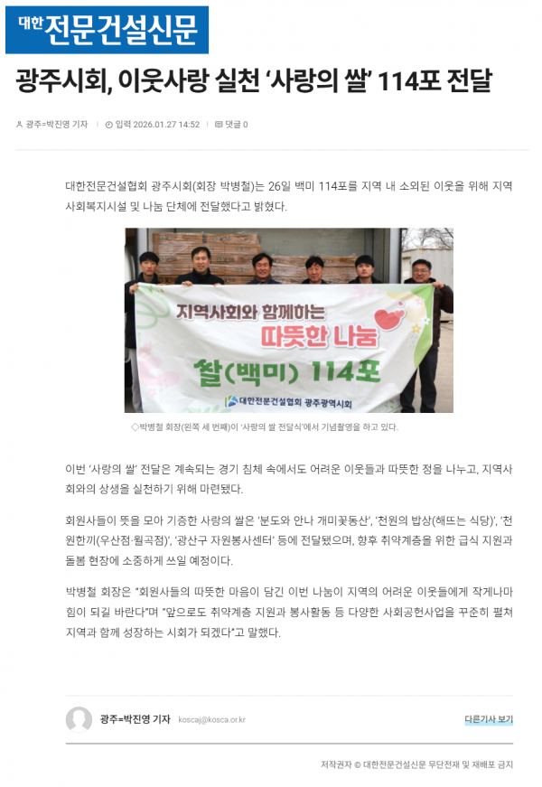 광주시회, 이웃사랑 실천 ‘사랑의 쌀’ 114포 전달 (대한전문건설신문) 페이지 정보 작성자 전문건설협회광주광역시회 댓글 0건 조회 343회 작성일 2026-02-02 09:36 목록 본문