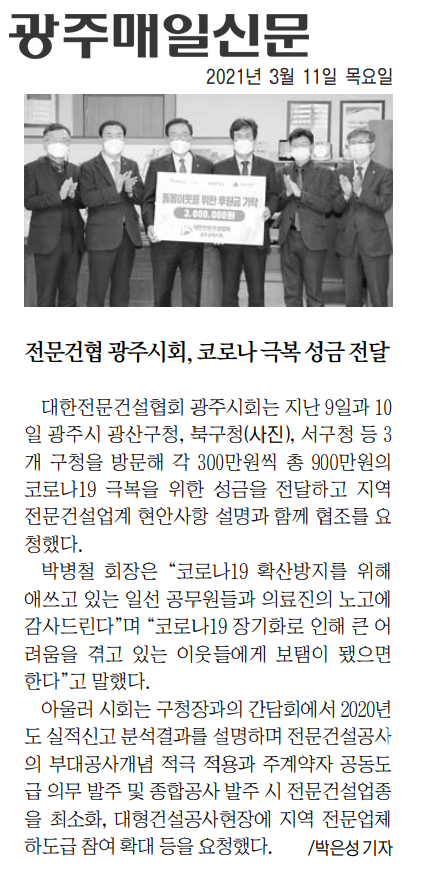 HOME > KOSCA광주 소개 > 전문건협 광주시회, 코로나 극복 성금 전달(광주매일신문) > 보도자료
