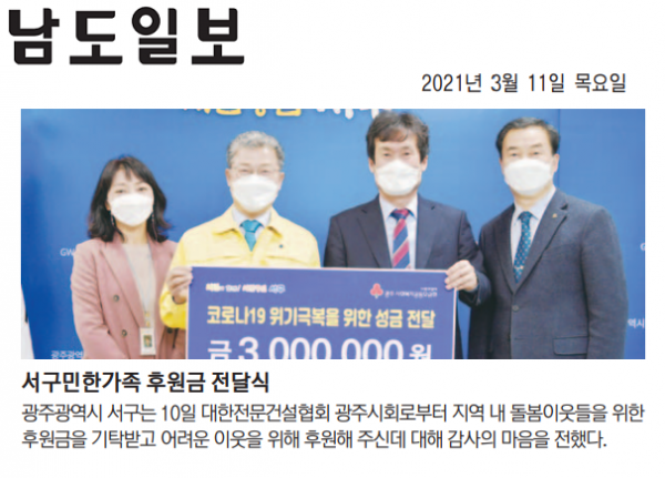 광주시회,자치구에 코로나19 극복 성금 전달 하도급 세일즈도(전문건설신문