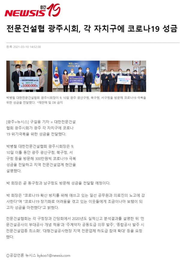 HOME > KOSCA광주 소개 > 전문건설협 광주시회, 각 자치구에 코로나10 성금(뉴시스) > 보도자료