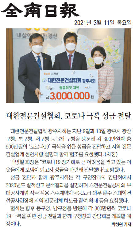 전문건설협 광주시회, 코로나19 성금 (호남매일신문)