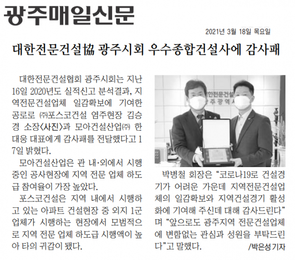 대한전문건설협회 광주시회 우수종합건설사에 감사패 (광주매일신문)