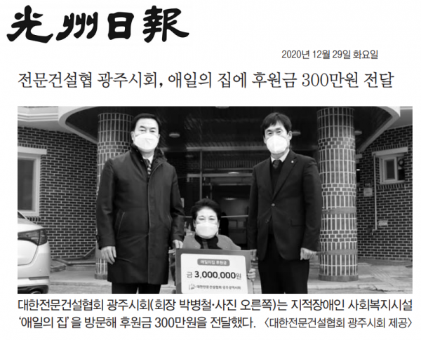 전문건설협회 광주시회, 애일의 집에 후원금 300만원 전달 (광주일보)