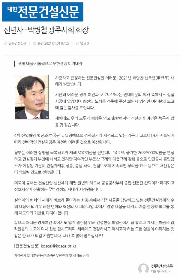 "회원사 수주 물량 확대.업계 위상 제고 앞장" (무등일보)