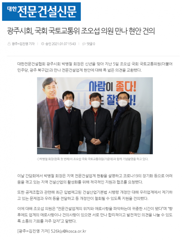 광주시회, 국회 국토교통위 조오섭 의원 만나 현안 건의 (대한전문건설신문