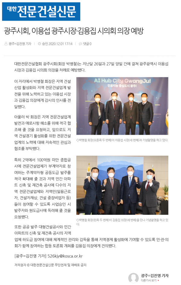 광주시회, 이용섭 광주시장·김용집 시의회 의장 예방(대한전문건설신문)