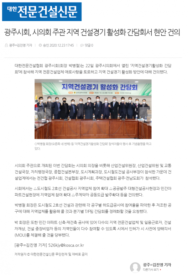 HOME > KOSCA광주 소개 > 광주시회, 시의회 주관 지역 건설경기 활성화 간담회서 현안 건의 (전문건 > 보도자료