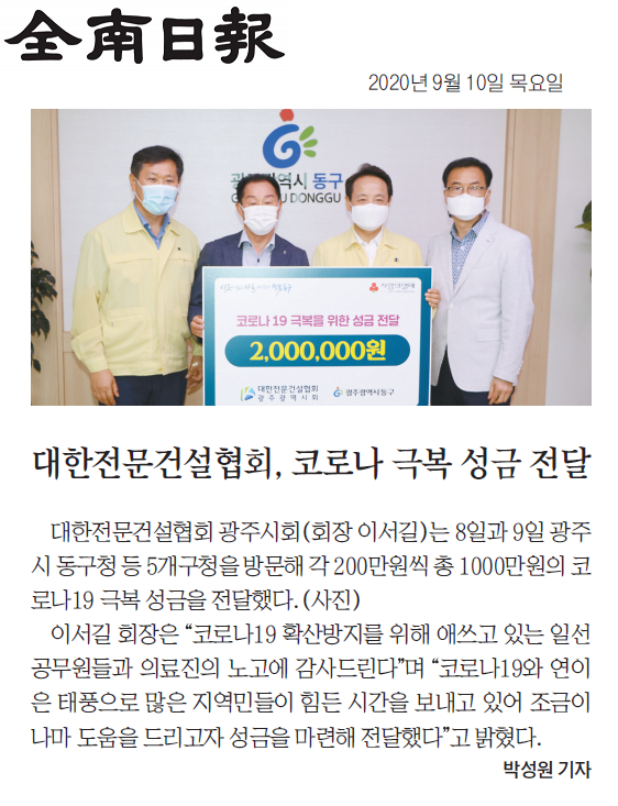 광주시회, 자치구에 코로나19 극복 성금 전달 (대한전문건설신문)