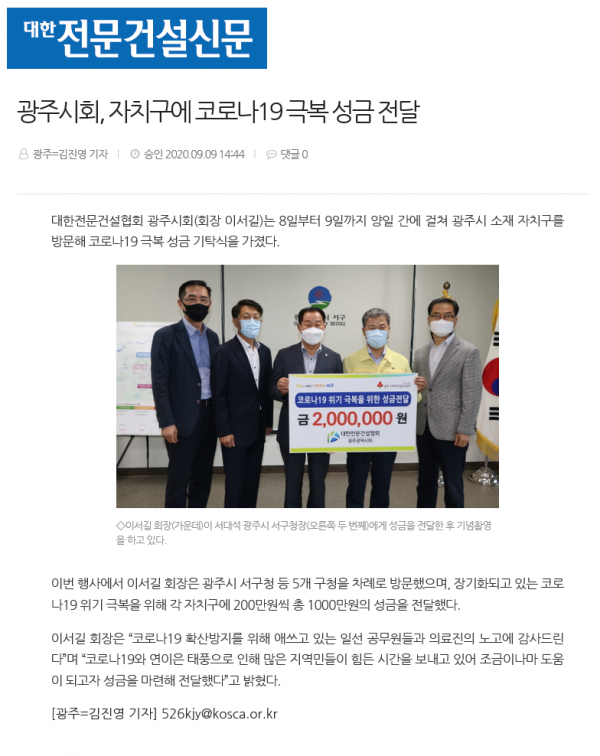 광주시회, 자치구에 코로나19 극복 성금 전달 (대한전문건설신문)