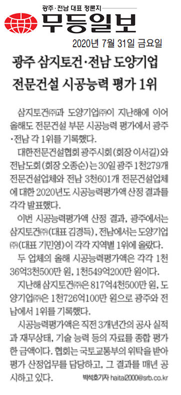 광주 삼지토건, 전남 도양기업 전문건설 시공능력평가 1위 (무등일보)