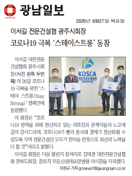 이서길 전문건설협회 광주시회장 '스테이스트롱'캠페인 동참 (남도일보)