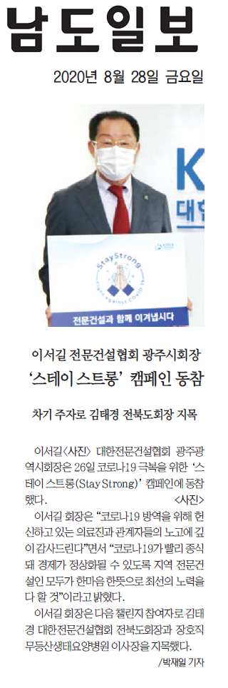 이서길 전문건설협회 광주시회장 '스테이스트롱'캠페인 동참 (남도일보)