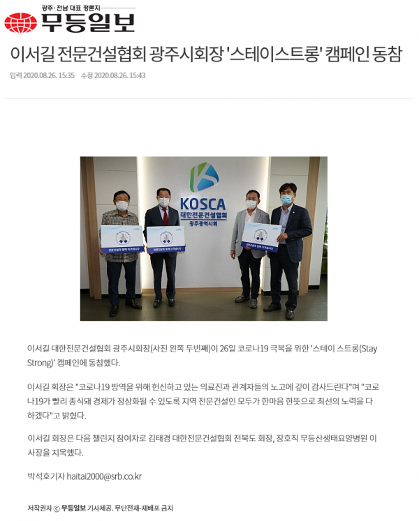 HOME > KOSCA광주 소개 > 이서길 전문건설협회 광주시회장\'스테이스트롱\'캠페인 동참(무등일보) > 보도자료