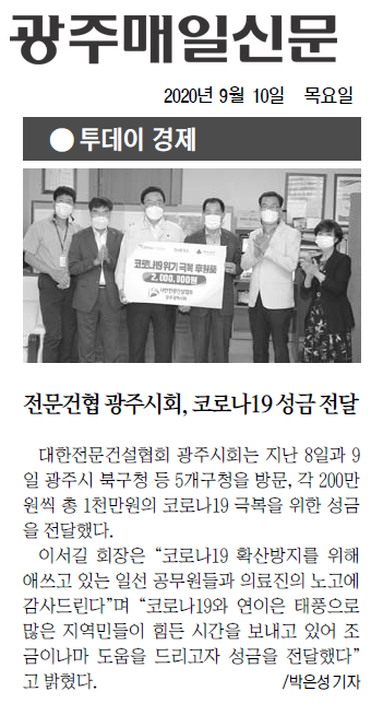 대한전문건설협회, 광주 5개구에 코로나 성금 1000만원 (광주일보)