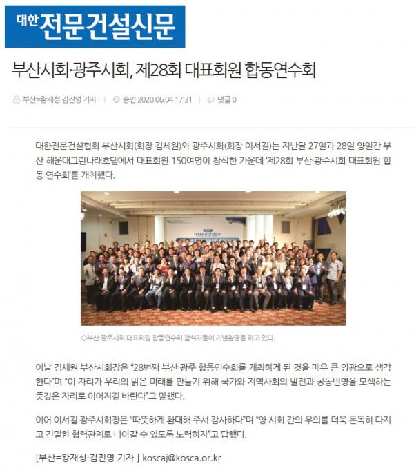 HOME > KOSCA광주 소개 > 광주시회.부산시회 제28회 대표회원 합동연수회 (대한전문건설신문) > 보도자료