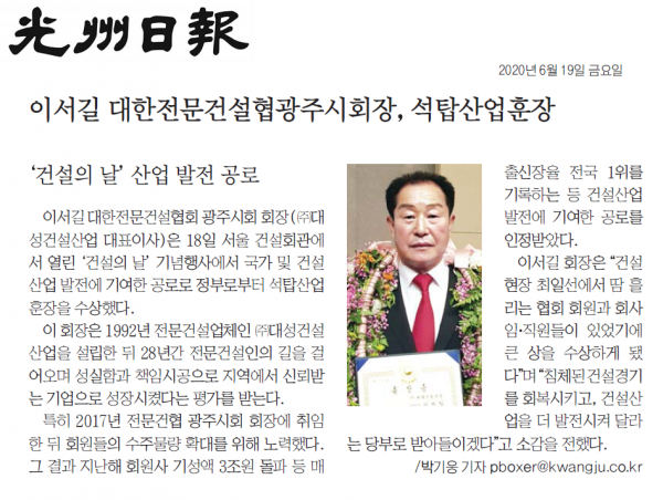 이서길 전문건설광주시회장, 건설의 날 석탑산업훈장 (전남일보)