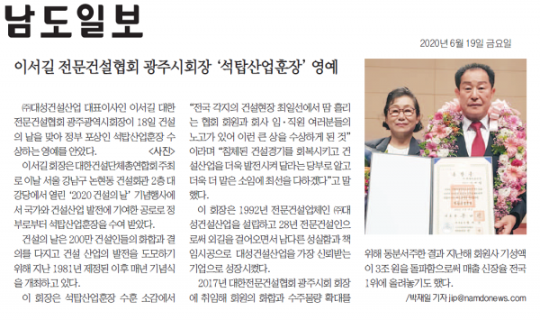 이서길 전문건설광주시회장, 건설의 날 석탑산업훈장 (전남일보)
