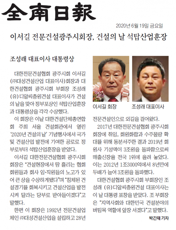 이서길 전문건설협회 광주시회장 '석탑산업훈장' 영예 (남도일보)