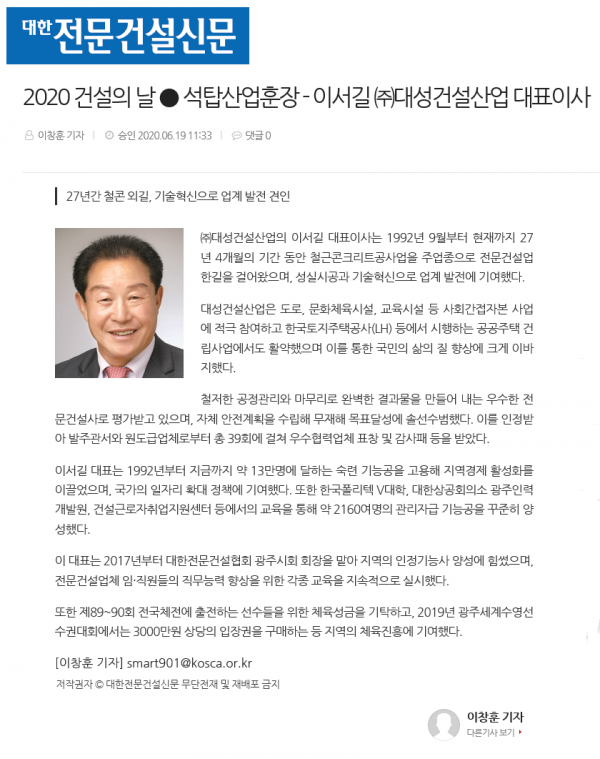 HOME > KOSCA광주 소개 > 20건설의 날,석탑산업훈장-이서길(주)대성건설산업 대표이사(전문건설신문) > 보도자료