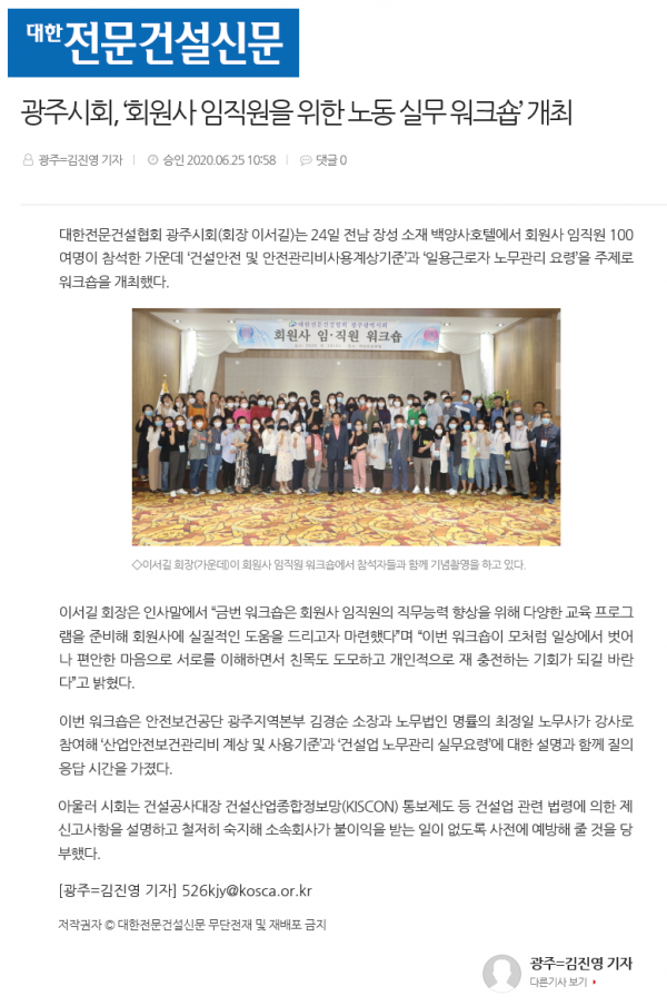 HOME > KOSCA광주 소개 > 광주시회,\'회원사 임직원을 위한 노동 실무 워크숍\'개최 (대한전문건설신문 > 보도자료