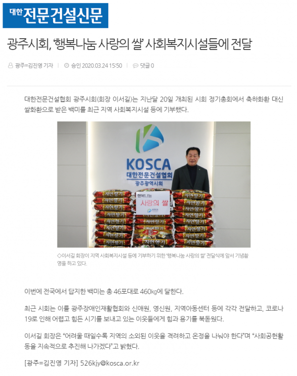 HOME > KOSCA광주 소개 > 광주시회, \'행복나눔 사랑의 쌀\' 사회복지시설들에 전달 (대한전문건설신문 > 보도자료