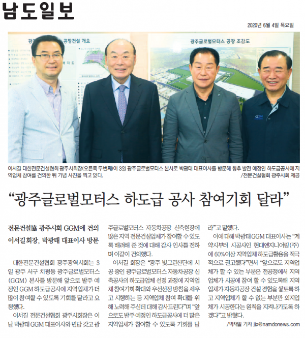 "광주글로벌모터스 하도급 공사 참여기회 달라" (남도일보)