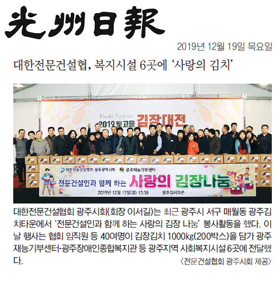대한전문건설협, 복지시설 6곳에 '사랑의 김치' (광주일보)