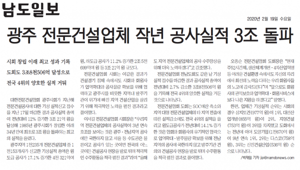 광주 전문건설업체 작년 공사실적 3조 돌파 (남도일보)