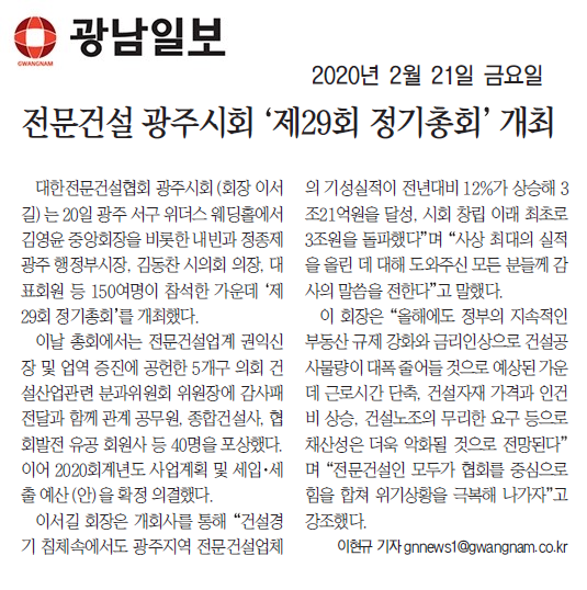 HOME > KOSCA광주 소개 > 전문건설 광주시회 \'제29회 정기총회\' 개최 (광남일보) > 보도자료