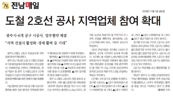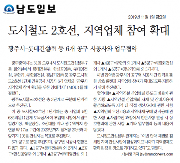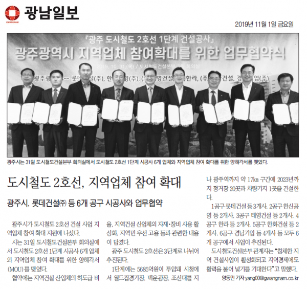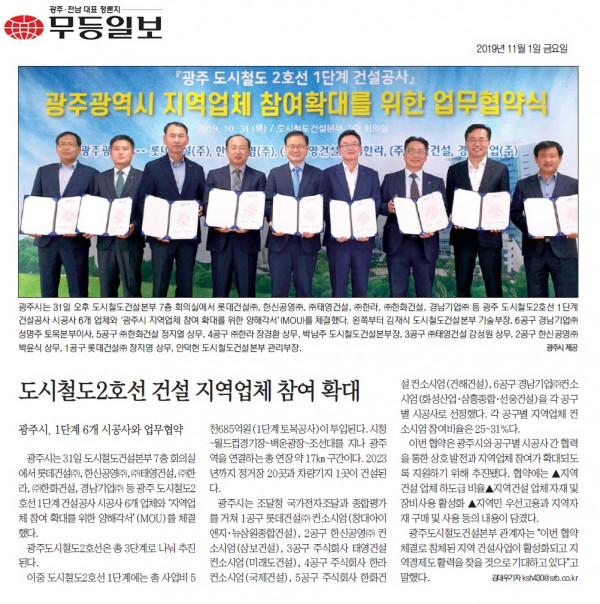 광주도시철도2호선 건설 지역업체 참여 확대를 위한 MOU(양해각서) 체결 페이지 정보 작성자 박진영 댓글 0건 조회 2,308회 작성일 2019-11-01 10:01 목록 본문 협회에서는 지난 10월 22일(화) 광주시 도시철도건설본부를 방문하고 도시철도2호선 건설공사에 지역업체 참여 확대를 건의한 결과 광주시에서 도시철도2호선 건설공사(6개공구) 시공사와 지역업체 참여 확대를 위한 MOU(양해각서)를 10월 31일(목) 체결 하고 지역 전문업체 적극 활용을 독려하였습니다.