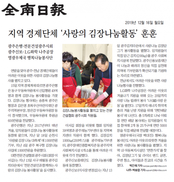 지역 경제단체'사랑의 김장나눔활동' 훈훈 (전남일보)