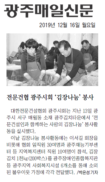 HOME > KOSCA광주 소개 > 전문건협 광주시회\'김장나눔\' 봉사 (광주매일신문) > 보도자료