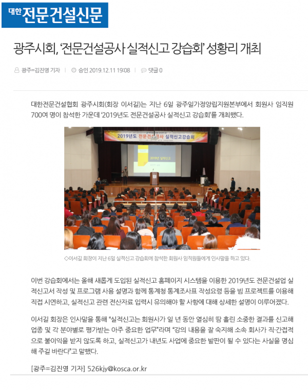 광주시회,'전문건설공사 실적신고 강습회'성황리 개최 (대한전문건설신문)