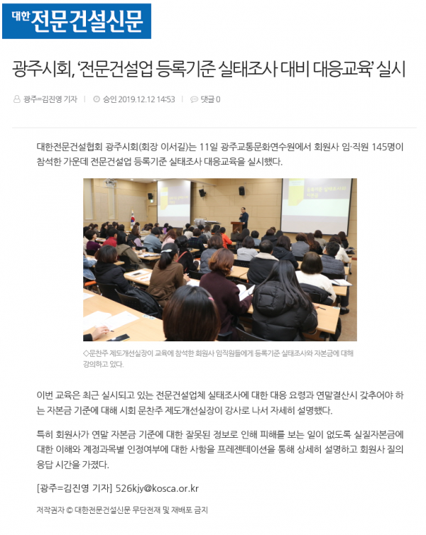 HOME > KOSCA광주 소개 > 광주시회,\'전문건설업 등록기준 실태조사 대비 대응교육\'실시(대한전문건설신 > 보도자료