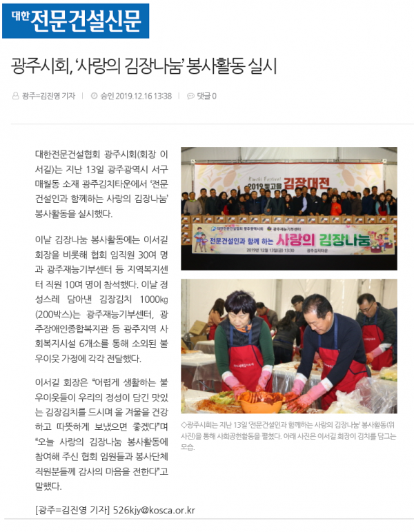 HOME > KOSCA광주 소개 > 광주시회,\'사랑의 김장나눔\'봉사활동 실시(대한전문건설신문) > 보도자료