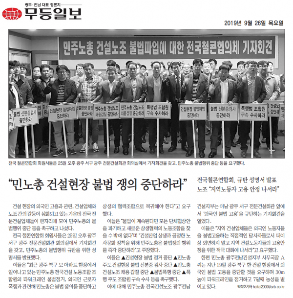 "민노총 건설현장 불법 쟁의 중단하라" (무등일보)