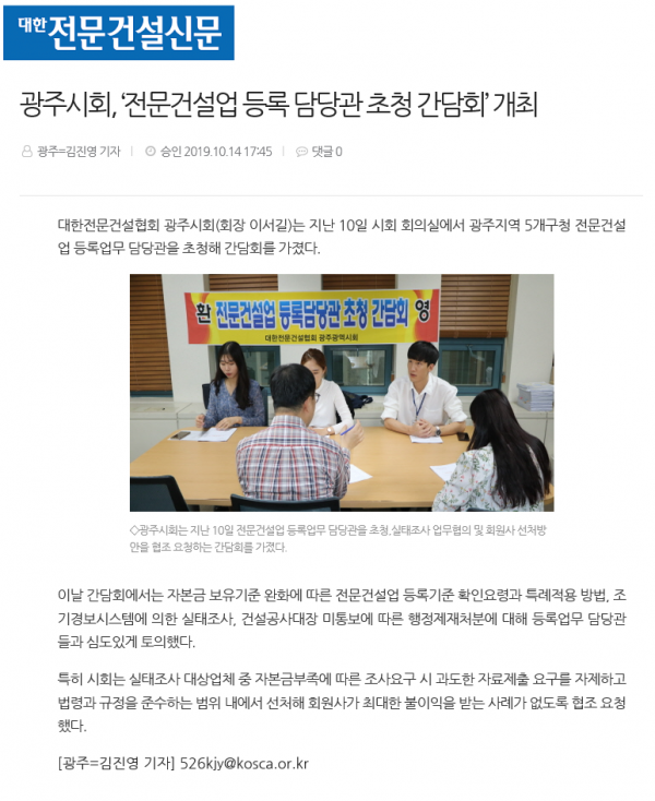HOME > KOSCA광주 소개 > 광주시회,\'전문건설업 등록 담당관 초청 간담회\' 개최 (대한전문건설신문) > 보도자료