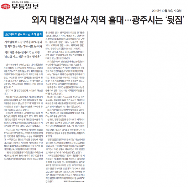 외지 대형건설사 지역 홀대...광주시는 '뒷짐' (무등일보)