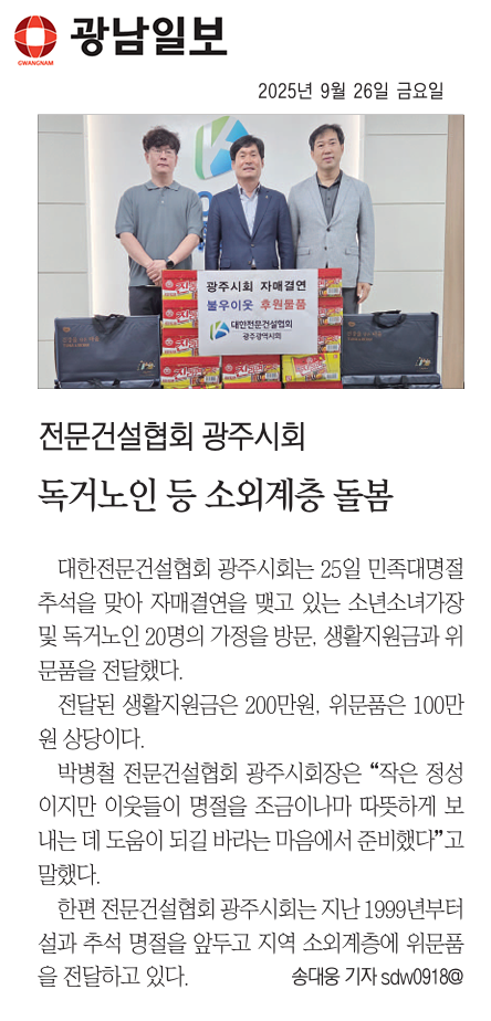 광주시회, 추석 맞아 ‘소년소녀가장·독거노인 위문’···지원금·위문품 전달(대한전문건설신문)