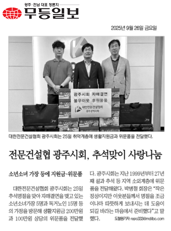HOME > KOSCA광주 소개 > 전문건설협 광주시회, 추석맞이 사랑나눔 (무등일보) > 보도자료