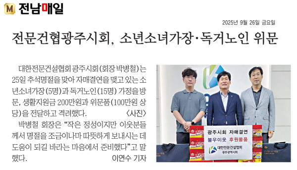 HOME > KOSCA광주 소개 > 전문건협광주시회, 소년소녀가장.독거노인 위문 (전남매일) > 보도자료