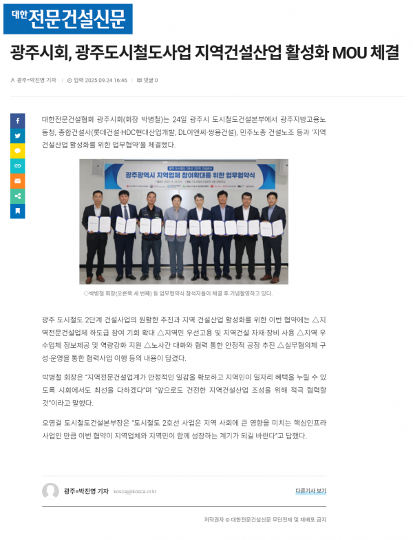 광주시회, 광주도시철도사업 지역건설산업 활성화 MOU 체결 (대한전문건설신문) 페이지 정보 작성자 전문건설협회광주광역시회 댓글 0건 조회 974회 작성일 2025-09-30 16:14 목록 본문