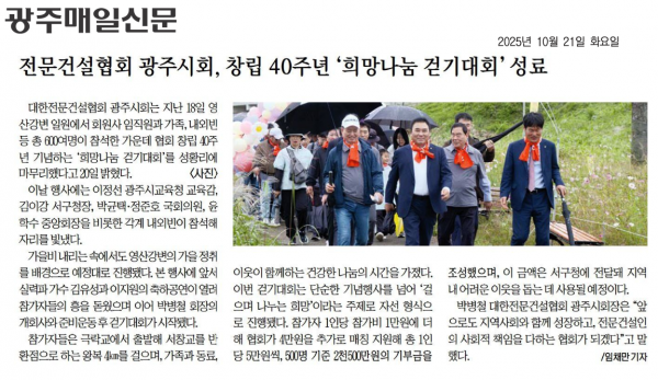 전문건설협회 광주시회, 창립 40주년 '희망나눔 걷기대회' 성료 (광주매일신문) 페이지 정보 작성자 전문건설협회광주광역시회 댓글 0건 조회 879회 작성일 2025-10-21 10:18 목록 본문