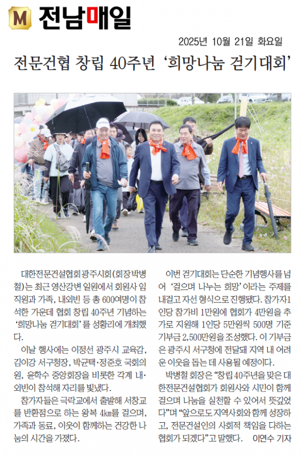 전문건협 창립 40주년 '희망나눔 걷기대회' (전남매일)