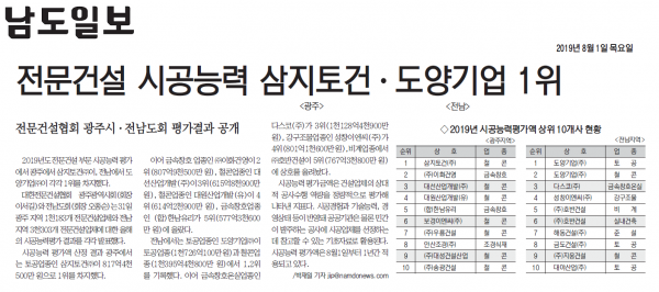 삼지토건.도양기업, 광주전남 전문건설 시공능력 1위 (전남일보)