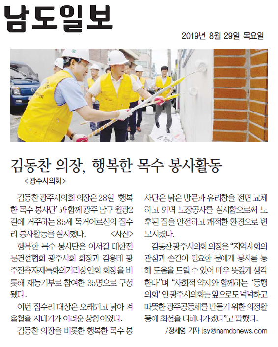 김동찬 광주시의회 의장 집수리 봉사 (전남매일신문)