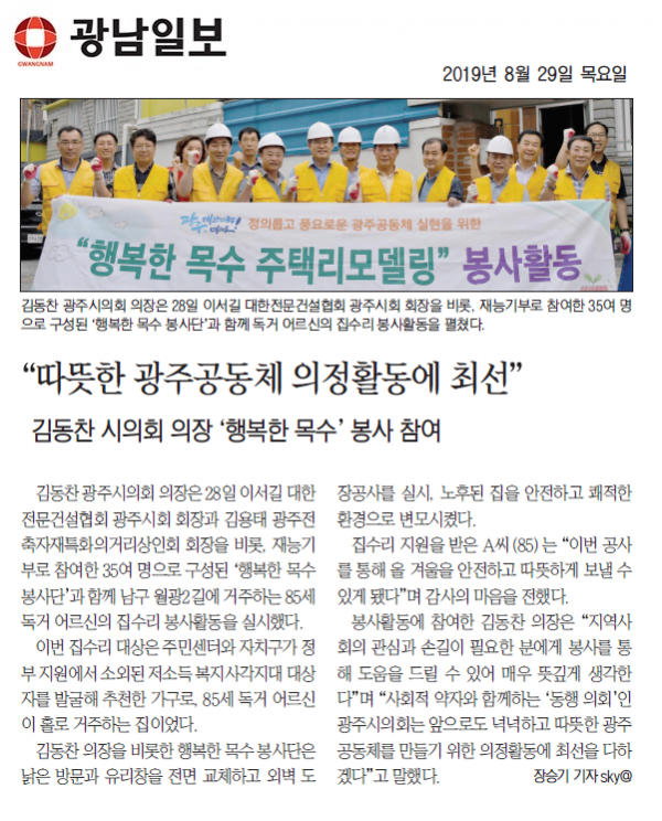 김동찬 광주시의회 의장 집수리 봉사 (전남매일신문)