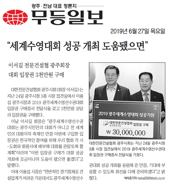 광주시회,2019광주세계수영선수권대회성공기원 입장권구매(대한전문건설신문)